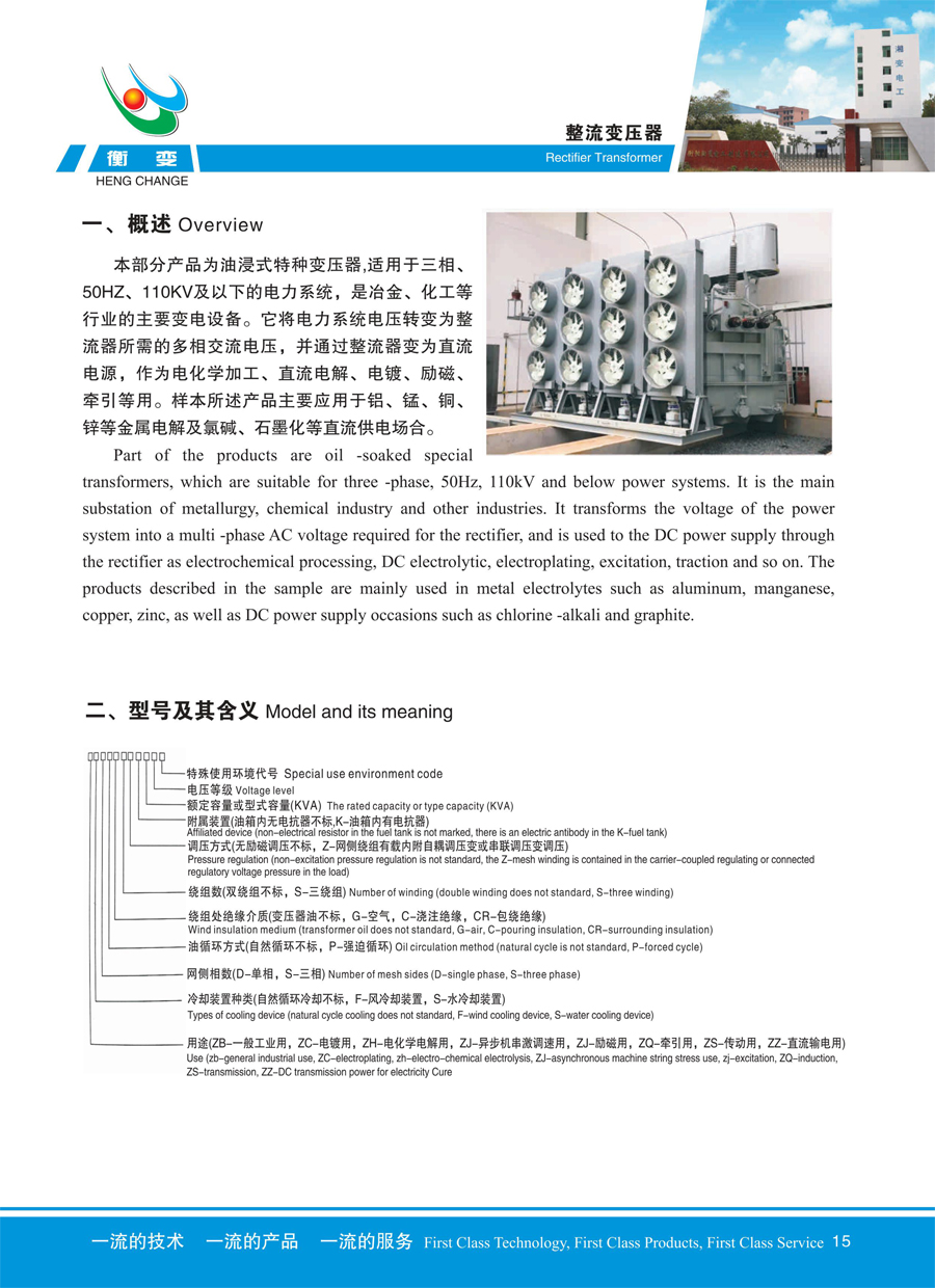 本部分產(chǎn)品為油浸式特種變壓器,適用于三相、50HZ、110KV及以下的電力系統(tǒng),是冶金、化工等行業(yè)的主要變電設(shè)備。它將電力系統(tǒng)電壓轉(zhuǎn)變?yōu)檎髌魉璧亩嘞嘟涣麟妷?,并通過整流器變?yōu)橹绷?/p>